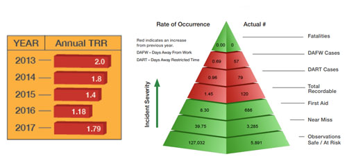 Despite continuing to be lower than the pharmaceutical average, and executing on a number of preventative activities to make employees safer, Perrigo’s Total Recordable Injury Rate (TRR) increased from 1.18 in 2016 to 1.79 in 2017. The first time in 5 consecutive years that TRR did not decline.